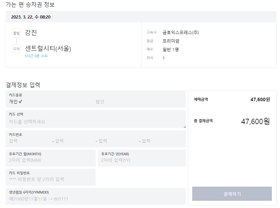 그러면 승차권 예매 정보를 확인할 수 있습니다. 카드정보를 입력하고 결제를 하면 예매가 완료됩니다.