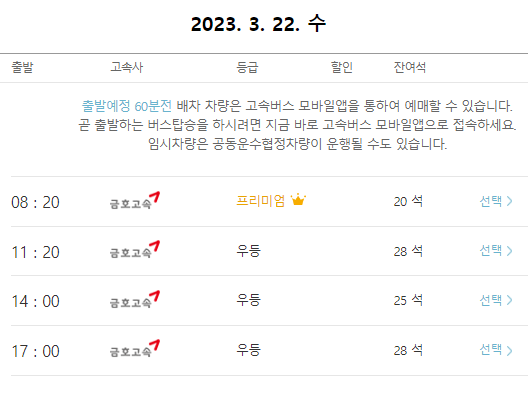 본인이 원하는 시간대의 센트럴시티행 고속버스를 선택합니다.