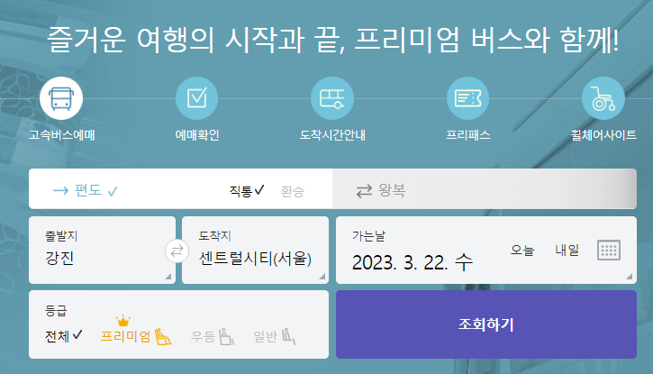 강진 고속버스터미널 시간표를 확인하기 위해서 고속버스 통합예매 홈페이지을 접속하시면 가운데에 예매하는 메뉴가 있습니다. 편도인지 왕복인지를 체크를 합니다. 출발지를 강진으로 선택하고 도착지를 센트럴시티로 선택하였습니다. 가는날짜를 (2023.03.22) 선택하고 조회를 클릭합니다.