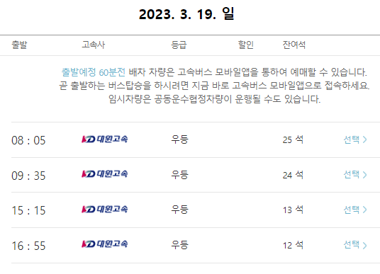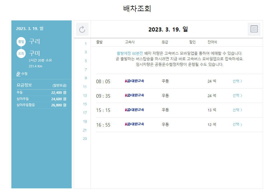본인이 원하는 시간대의 구미행 고속버스를 선택합니다.