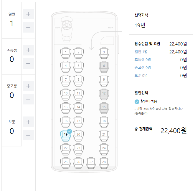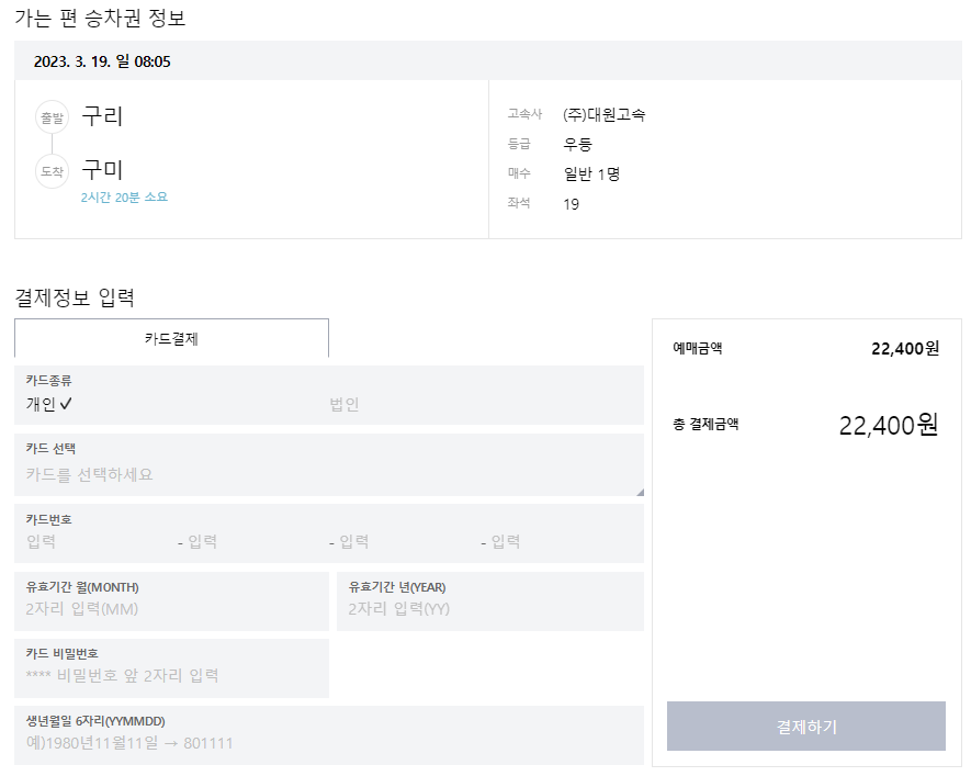 그러면 승차권 예매 정보를 확인할 수 있습니다. 카드정보를 입력하고 결제를 하면 예매가 완료됩니다.