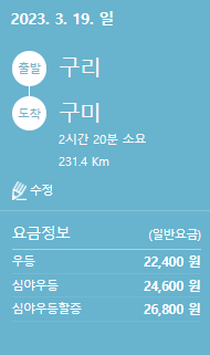 구리에서 구미 가는 고속버스 요금 및 소요시간(2023.03.19)입니다. 요금은 우등(22,400원), 고속(24,600원), 심야우등(26,800원)이며, 소요시간은 2시간 20분 예상됩니다.