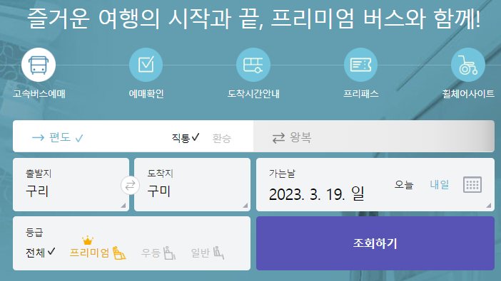 구리 고속버스터미널 시간표를 확인하기 위해서 고속버스 통합예매 홈페이지을 접속하시면 가운데에 예매하는 메뉴가 있습니다. 편도인지 왕복인지를 체크를 합니다. 출발지를 구리로 선택하고 도착지를 구미로 선택하였습니다. 가는날짜를 (2023.03.19) 선택하고 조회를 클릭합니다.