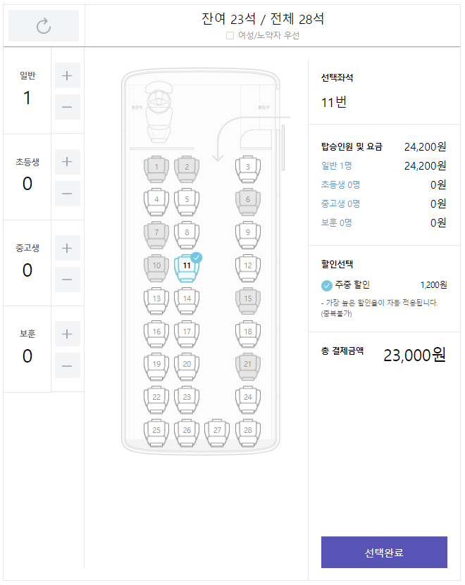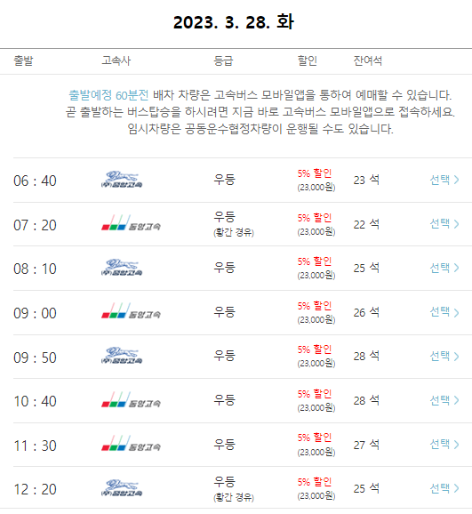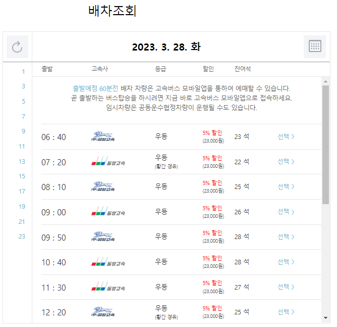본인이 원하는 시간대의 서울경부행 고속버스를 선택합니다.