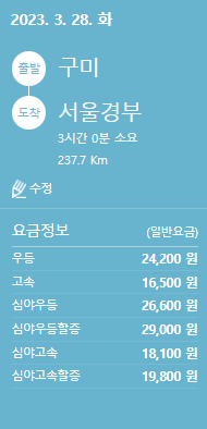 구미에서 서울경부가는 고속버스 요금 및 소요시간(2023.03.28)입니다. 요금은 우등(24,200원), 고속(16,500원), 심야우등(26,600원), 심야우등할증(29,000원), 심야고속(18,100원), 심야고속할증(19,800원)이며, 소요시간은 3시간 예상됩니다.