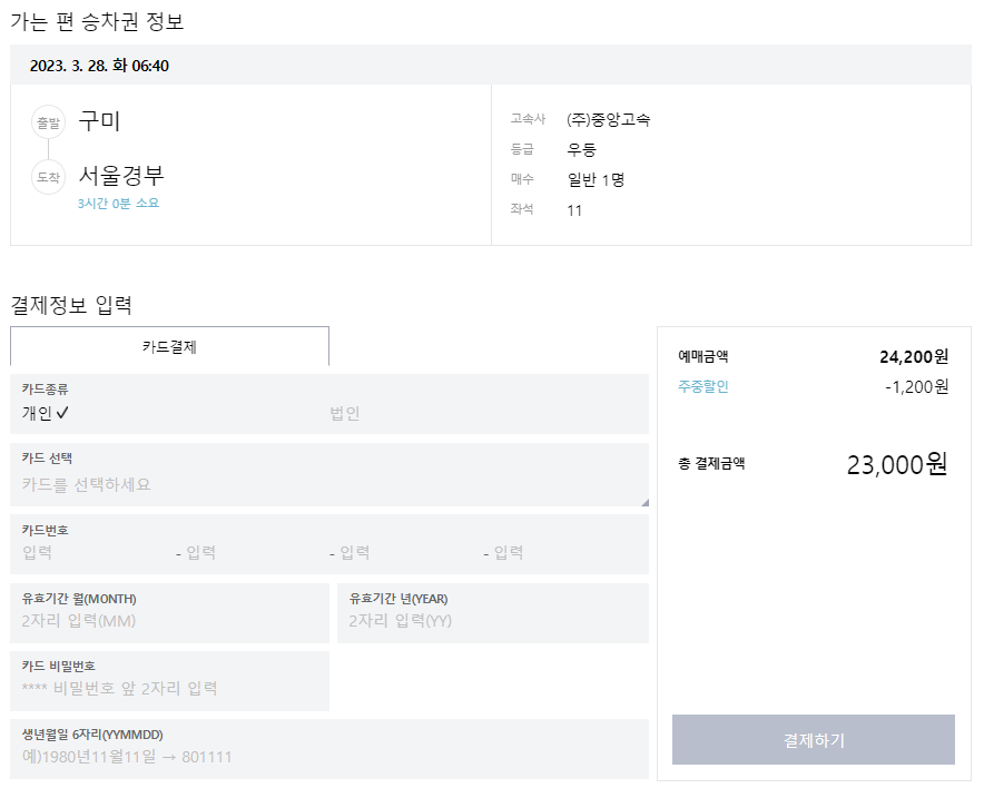 그러면 승차권 예매 정보를 확인할 수 있습니다. 카드정보를 입력하고 결제를 하면 예매가 완료됩니다.