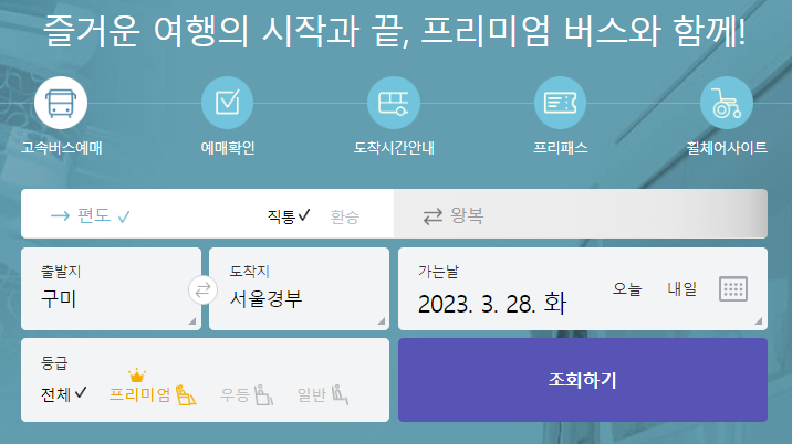 구미 고속버스터미널 시간표를 확인하기 위해서 고속버스 통합예매 홈페이지을 접속하시면 가운데에 예매하는 메뉴가 있습니다. 편도인지 왕복인지를 체크를 합니다. 출발지를 구미로 선택하고 도착지를 서울경부로 선택하였습니다. 가는날짜를 (2023.03.28) 선택하고 조회를 클릭합니다.