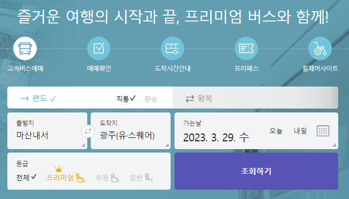 내서 고속버스터미널 시간표를 확인하기 위해서 고속버스 통합예매 홈페이지을 접속하시면 가운데에 예매하는 메뉴가 있습니다. 편도인지 왕복인지를 체크를 합니다. 출발지를 내서로 선택하고 도착지를 광주로 선택하였습니다. 가는날짜를 (2023.03.29) 선택하고 조회를 클릭합니다.