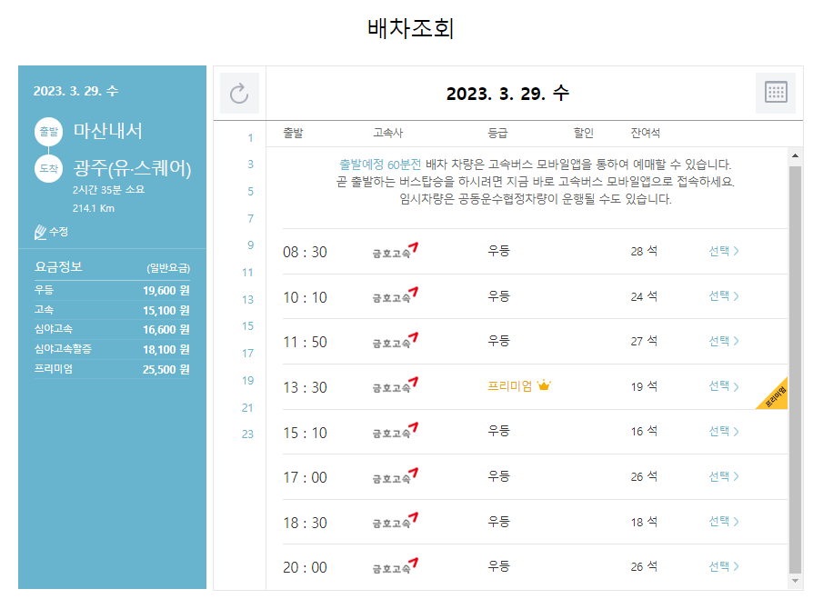 본인이 원하는 시간대의 광주(유스퀘어)행 고속버스를 선택합니다.