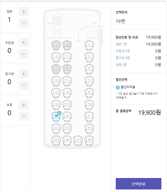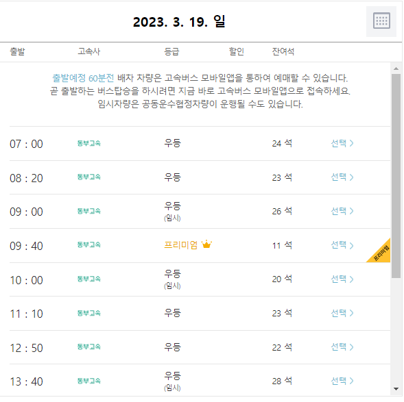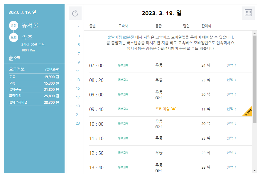 본인이 원하는 시간대의 속초행 고속버스를 선택합니다.