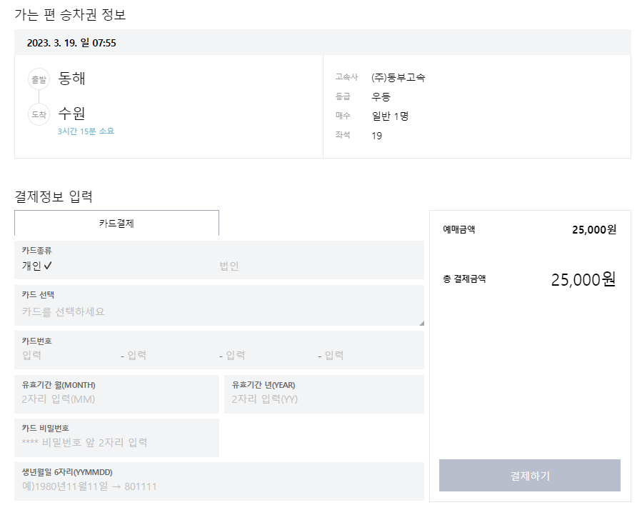 그러면 승차권 예매 정보를 확인할 수 있습니다. 카드정보를 입력하고 결제를 하면 예매가 완료됩니다.