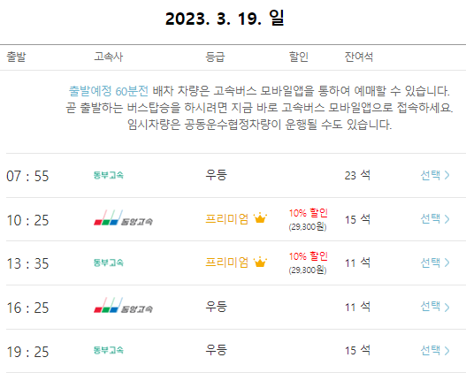 본인이 원하는 시간대의 수원행 고속버스를 선택합니다.