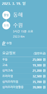 동해에서 수원 가는 고속버스 요금 및 소요시간(2023.03.19)입니다. 요금은 우등(25,000원), 고속(19,300원), 심야우등(21,200원), 프리미엄(32,500원), 심야프리미엄(35,700원), 심야프리미엄할증(39,000원)이며, 소요시간은 3시간 15분 예상됩니다.