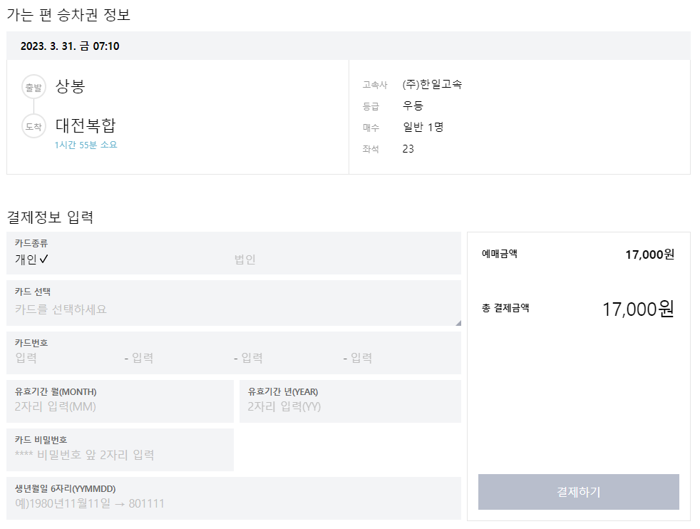 그러면 승차권 예매 정보를 확인할 수 있습니다. 카드정보를 입력하고 결제를 하면 예매가 완료됩니다.