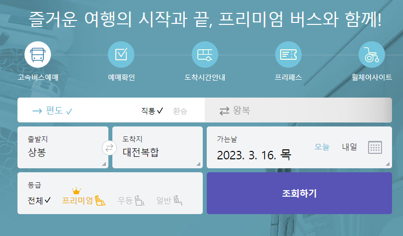 상봉 고속버스터미널 시간표를 확인하기 위해서 고속버스 통합예매 홈페이지을 접속하시면 가운데에 예매하는 메뉴가 있습니다. 편도인지 왕복인지를 체크를 합니다. 출발지를 상봉으로 선택하고 도착지를 대전복합으로 선택하였습니다. 가는날짜를 (2023.03.31) 선택하고 조회를 클릭합니다.