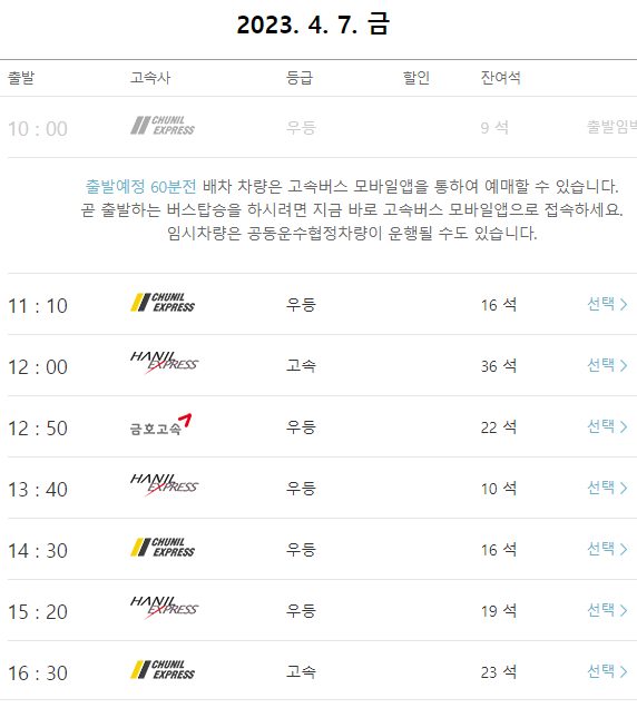 본인이 원하는 시간대의 서울경부행 고속버스를 선택합니다.