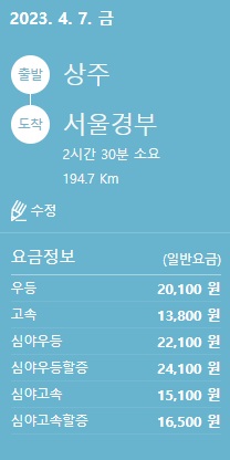 상주에서 서울경부로 가는 고속버스 요금 및 소요시간(2023.04.07)입니다. 요금은 우등(20,100원), 고속(13,800원), 심야우등(22,100원), 심야우등할증(24,100원), 심야고속(15,100원), 심야고속할증(16,500원)이며, 소요시간은 2시간 30분 예상됩니다.