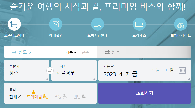 상주 고속버스터미널 시간표를 확인하기 위해서 고속버스 통합예매 홈페이지을 접속하시면 가운데에 예매하는 메뉴가 있습니다. 편도인지 왕복인지를 체크를 합니다. 출발지를 상주로 선택하고 도착지를 서울경부로 선택하였습니다. 가는날짜를 (2023.04.07) 선택하고 조회를 클릭합니다.