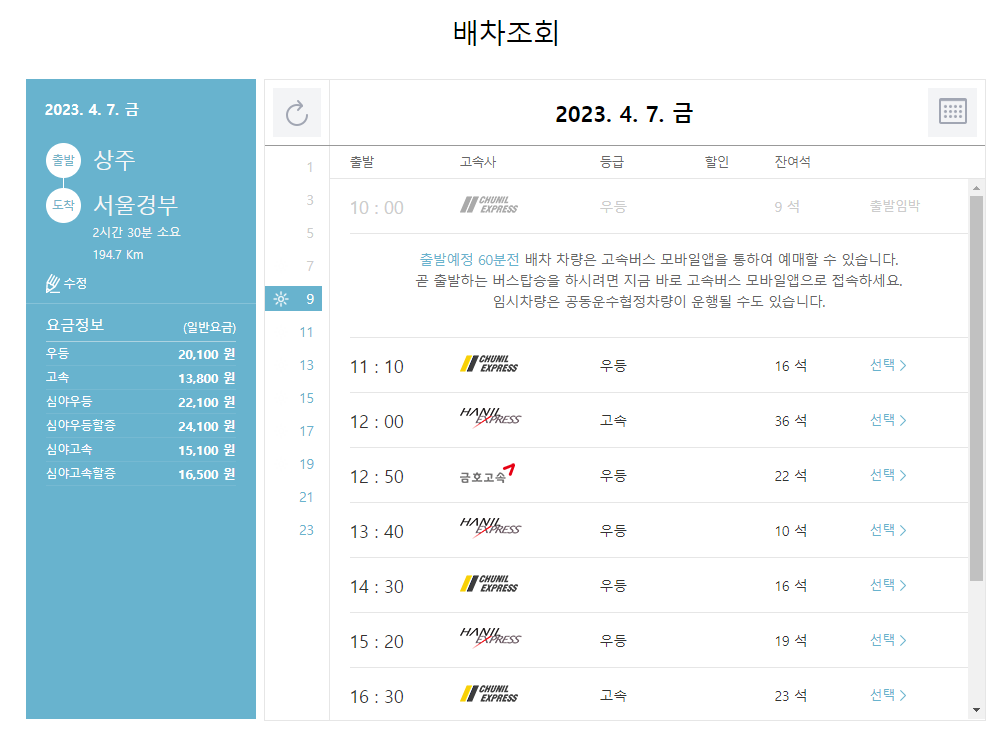 본인이 원하는 시간대의 서울경부행 고속버스를 선택합니다.