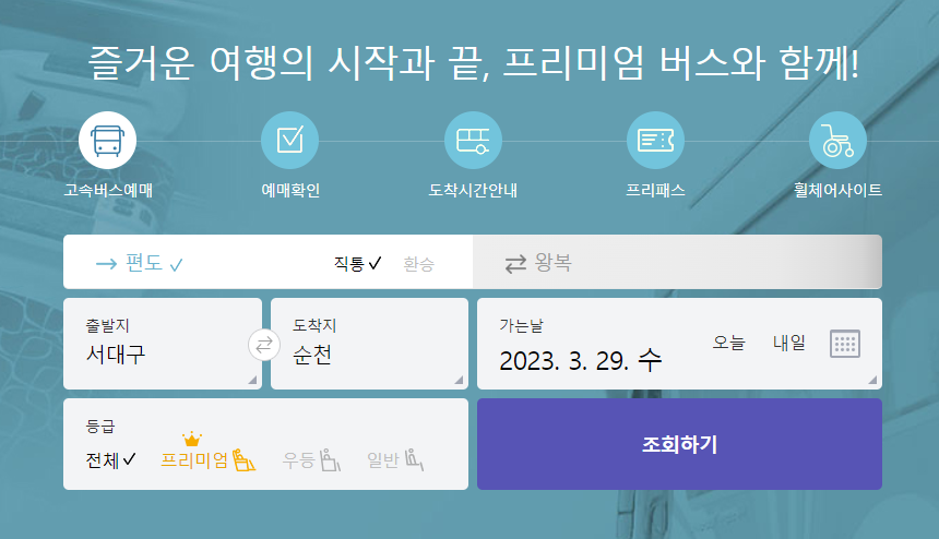 서대구 고속버스터미널 시간표를 확인하기 위해서 고속버스 통합예매 홈페이지을 접속하시면 가운데에 예매하는 메뉴가 있습니다. 편도인지 왕복인지를 체크를 합니다. 출발지를 서대구로 선택하고 도착지를 순천으로 선택하였습니다. 가는날짜를 (2023.03.29) 선택하고 조회를 클릭합니다.
