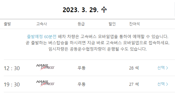 본인이 원하는 시간대의 순천행 고속버스를 선택합니다.