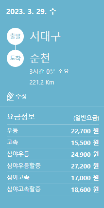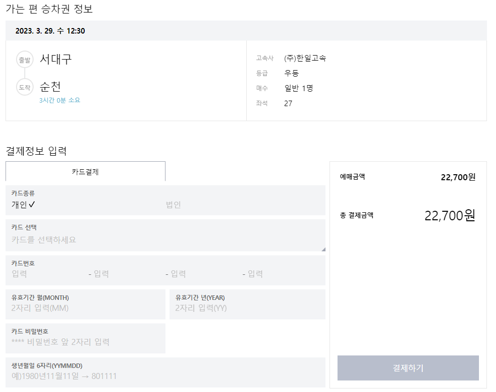 그러면 승차권 예매 정보를 확인할 수 있습니다. 카드정보를 입력하고 결제를 하면 예매가 완료됩니다.
