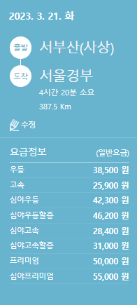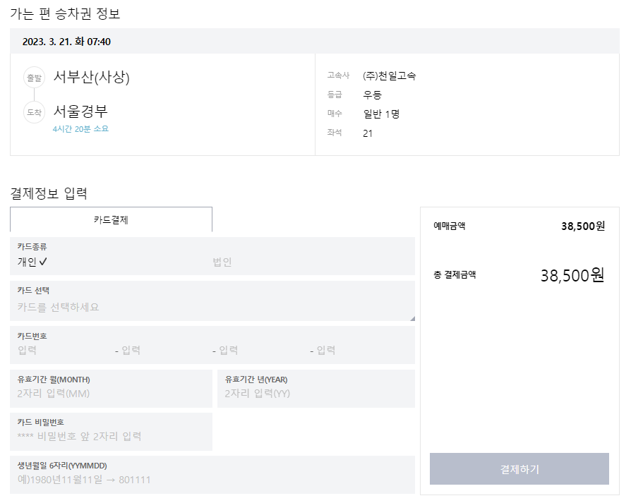 그러면 승차권 예매 정보를 확인할 수 있습니다. 카드정보를 입력하고 결제를 하면 예매가 완료됩니다.