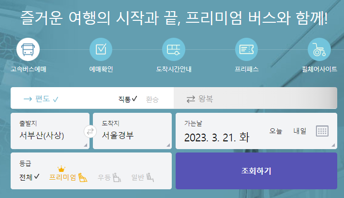 서부산(사상) 고속버스터미널 시간표를 확인하기 위해서 고속버스 통합예매 홈페이지을 접속하시면 가운데에 예매하는 메뉴가 있습니다. 편도인지 왕복인지를 체크를 합니다. 출발지를 서부산(사상)로 선택하고 도착지를 서울경부로 선택하였습니다. 가는날짜를 (2023.03.21) 선택하고 조회를 클릭합니다.