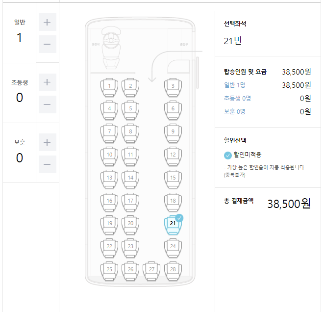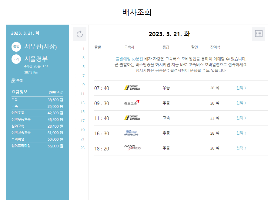 본인이 원하는 시간대의 서울경부행 고속버스를 선택합니다.