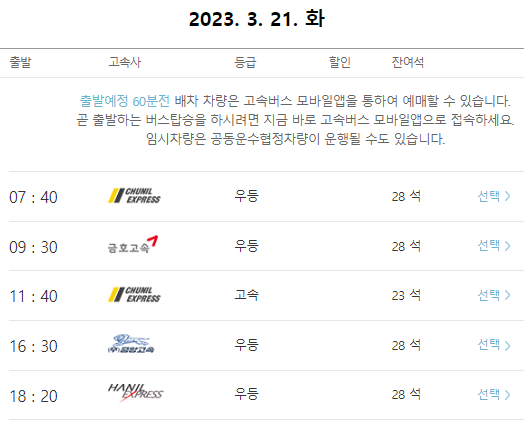 본인이 원하는 시간대의 서울경부행 고속버스를 선택합니다.