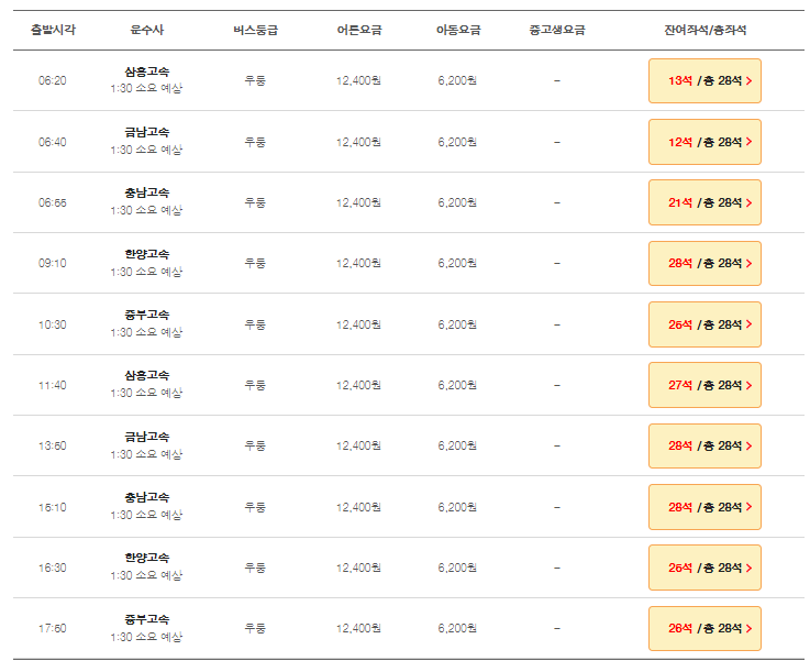 출발시간 및 요금을 확인하시고 세종으로 가는 버스를 선택합니다.