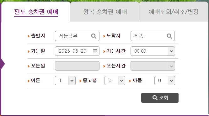 서울남부 시외버스터미널 시간표를 확인하기 위해서 시외버스 예매시스템 홈페이지에 접속하시고 승차권예매/조회 서비스를 이용하시면 됩니다. 출발지와 도착지, 그리고 가는일과 가는시간을 작성하시고 조회를 클릭 하시면 됩니다. 저는 출발지를 서울남부 시외버스터미널로 선택하고 도착지를 세종 시외버스터미널로 입력하고 가는일을 2023.03.20일로 입력한 후 조회를 클릭 했습니다.