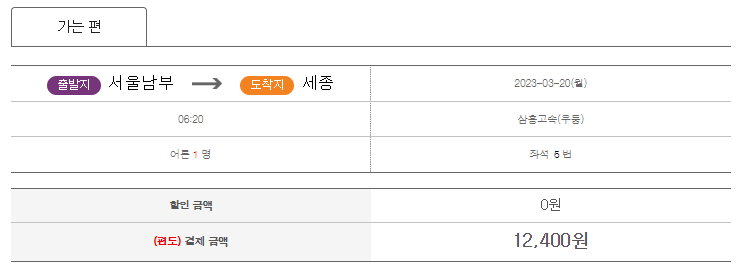 서울남부에서 세종 가는 시외버스터미널 요금 및 소요시간(2023.03.20)입니다. 요금은 어른(12,400원), 어린이(6,200원), 중고생(12,000원)이며, 소요시간은 1시간 40분 예상됩니다.