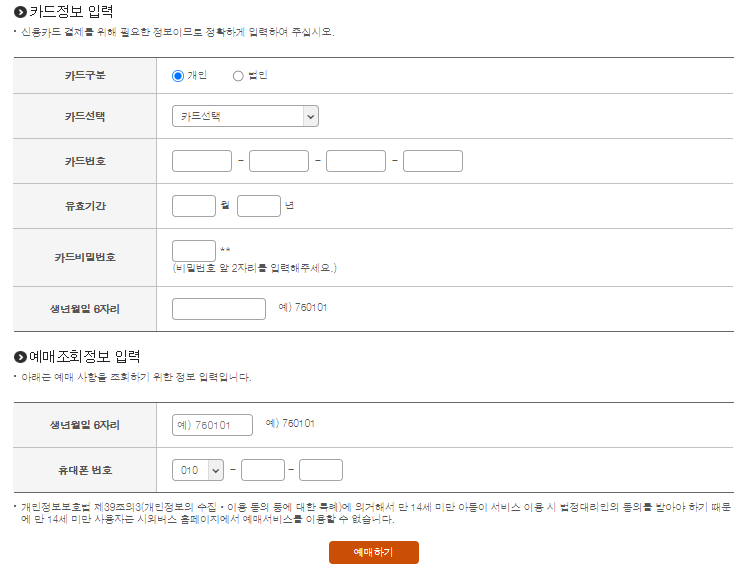- 일부 체크카드 및 일부 법인카드는 예매가 제한될 수 있습니다.
