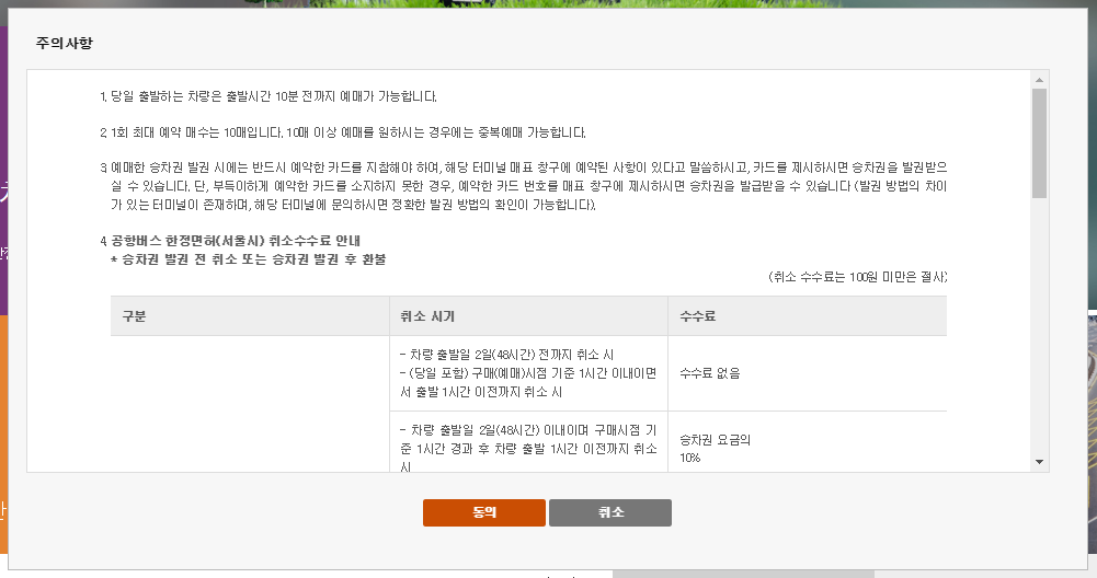 - 출발시간이 지난 후에는 승차권을 발권받을 수 없습니다. 출발 당일 터미널 혼잡에 대비하여 출발 시간보다 여유있게 터미널에 도착하셔서 발권받으시기 바랍니다.
