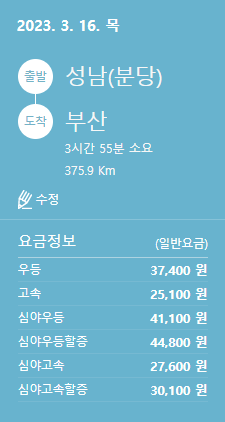 성남(분당)에서 부산 가는 고속버스 요금 및 소요시간(2023.03.16)입니다. 요금은 우등(37,400원), 고속(25,100원), 심야우등(41,100원), 심야우등할증(44,800원), 심야고속(27,600원), 심야고속할증(30,100원)이며, 소요시간은 3시간 55분 예상됩니다.
