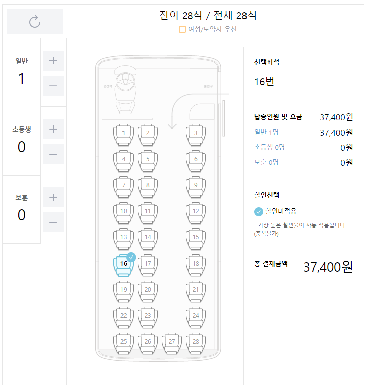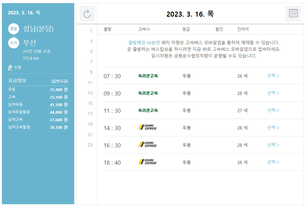 본인이 원하는 시간대의 부산행 고속버스를 선택합니다.