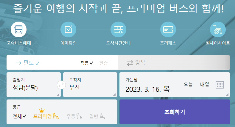 성남 고속버스터미널 시간표를 확인하기 위해서 고속버스 통합예매 홈페이지을 접속하시면 가운데에 예매하는 메뉴가 있습니다. 편도인지 왕복인지를 체크를 합니다. 출발지를 성남으로 선택하고 도착지를 부산으로 선택하였습니다. 가는날짜를 (2023.03.16) 선택하고 조회를 클릭합니다.