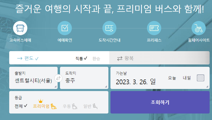센트럴시티 고속버스터미널 시간표를 확인하기 위해서 고속버스 통합예매 홈페이지을 접속하시면 가운데에 예매하는 메뉴가 있습니다. 편도인지 왕복인지를 체크를 합니다. 출발지를 센트럴시티로 선택하고 도착지를 충주로 선택하였습니다. 가는날짜를 (2023.03.26) 선택하고 조회를 클릭합니다.