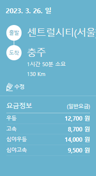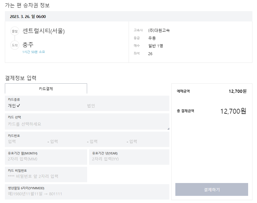 그러면 승차권 예매 정보를 확인할 수 있습니다. 카드정보를 입력하고 결제를 하면 예매가 완료됩니다.