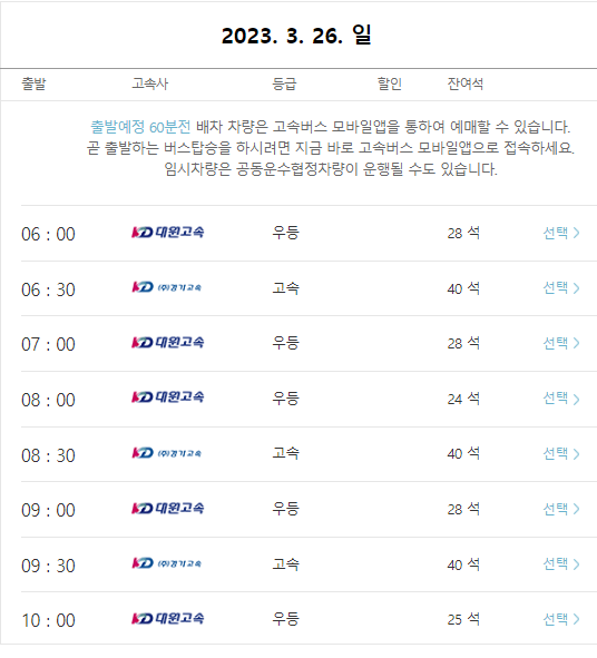 본인이 원하는 시간대의 충주행 고속버스를 선택합니다.