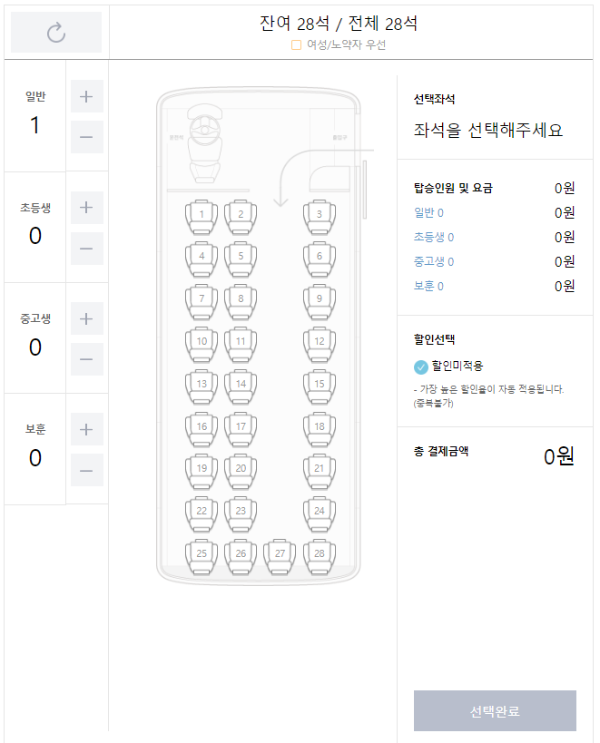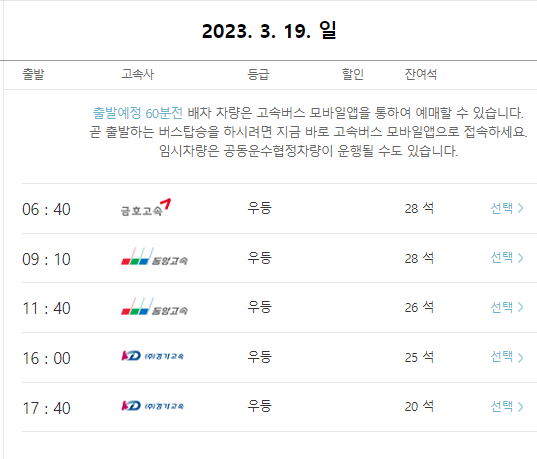 본인이 원하는 시간대의 여수행 고속버스를 선택합니다.