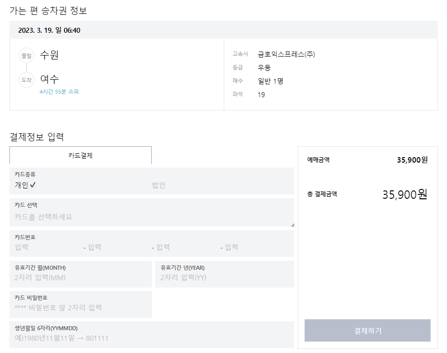 그러면 승차권 예매 정보를 확인할 수 있습니다. 카드정보를 입력하고 결제를 하면 예매가 완료됩니다.