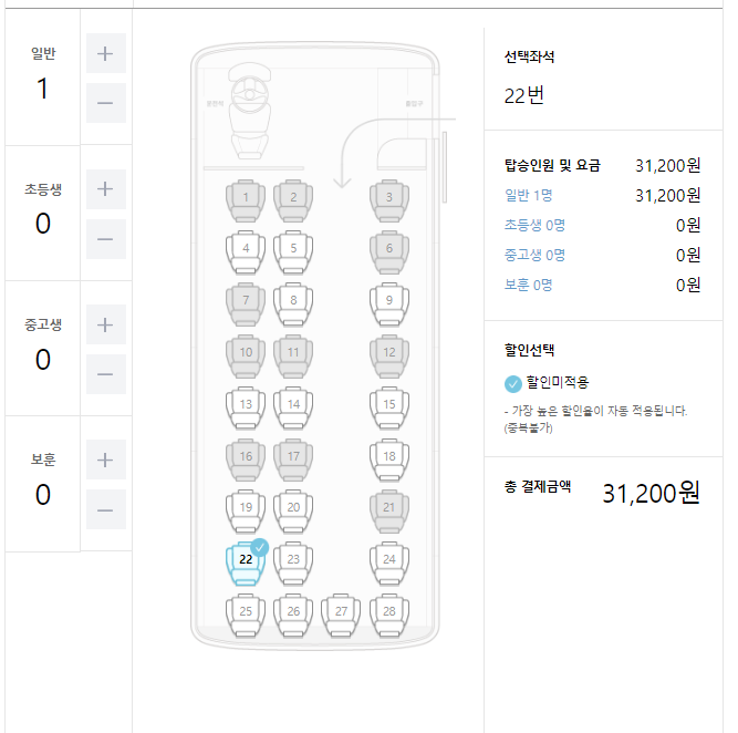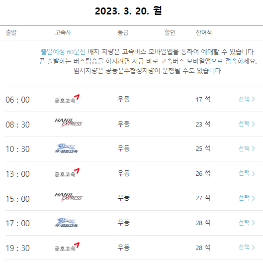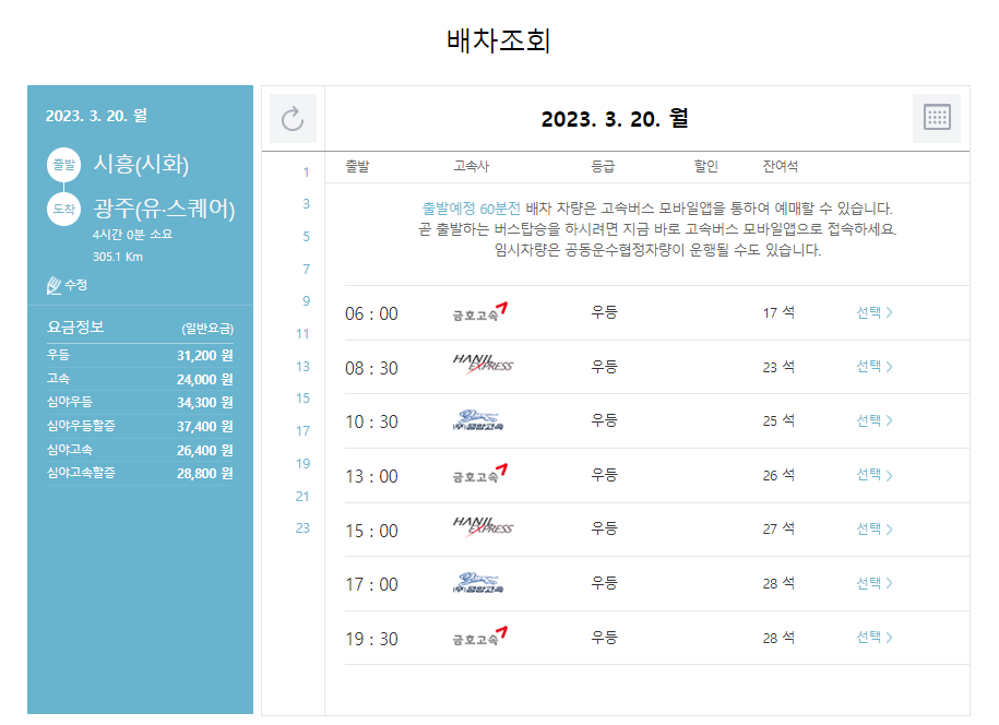 본인이 원하는 시간대의 광주행 고속버스를 선택합니다.