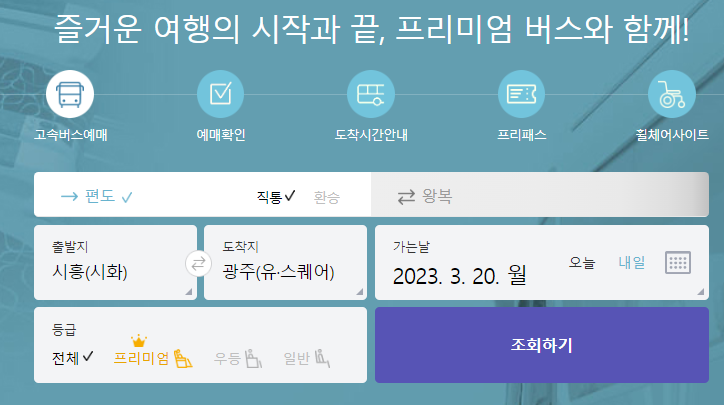시흥(시화) 고속버스터미널 시간표를 확인하기 위해서 고속버스 통합예매 홈페이지을 접속하시면 가운데에 예매하는 메뉴가 있습니다. 편도인지 왕복인지를 체크를 합니다. 출발지를 시흥으로 선택하고 도착지를 광주로 선택하였습니다. 가는날짜를 (2023.03.20) 선택하고 조회를 클릭합니다.