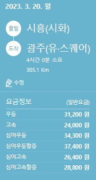 시흥에서 광주 가는 고속버스 요금 및 소요시간(2023.03.20)입니다. 요금은 우등(31,200원), 고속(24,000원), 심야우등(34,300원), 심야우등할증(37,400원), 심야고속(26,400원), 심야고속할증(28,800원)이며, 소요시간은 4시간 예상됩니다.