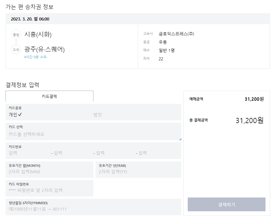 그러면 승차권 예매 정보를 확인할 수 있습니다. 카드정보를 입력하고 결제를 하면 예매가 완료됩니다.