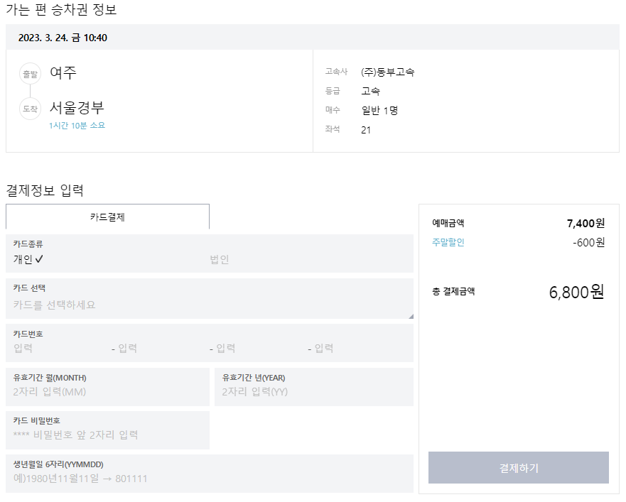 그러면 승차권 예매 정보를 확인할 수 있습니다. 카드정보를 입력하고 결제를 하면 예매가 완료됩니다.