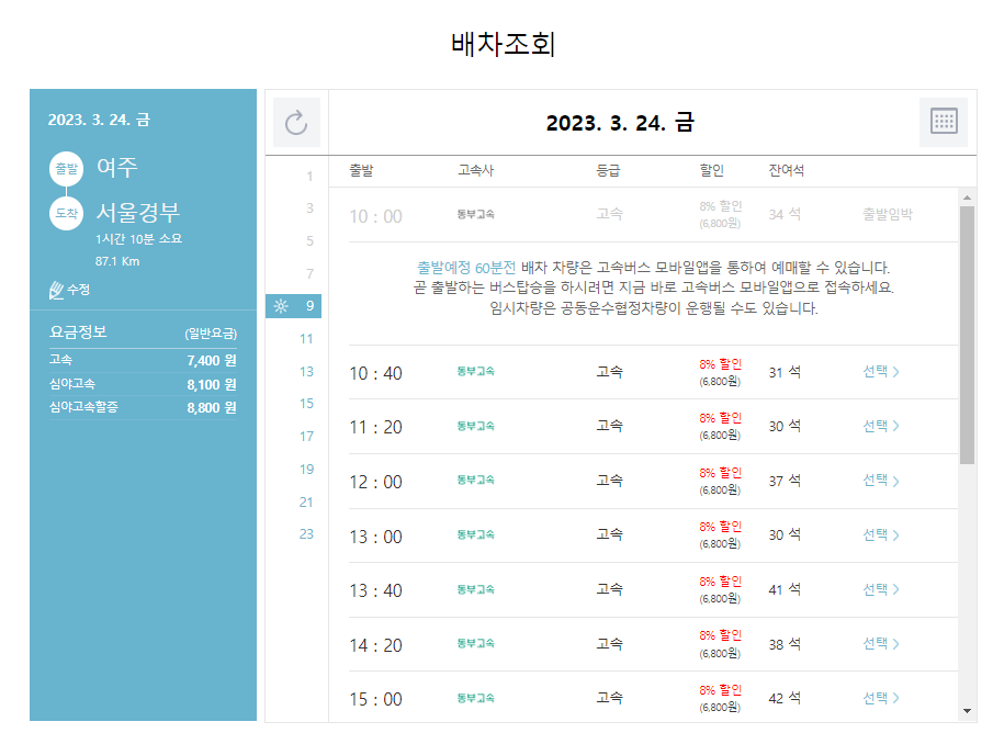 여주 고속버스터미널에서 서울경부 가는 2023.03.24 시간표를 확인할 수 있습니다. 예매는 출발 전 10분까지 가능하며, 고속버스 통합예매(pc)과 코버스(모바일)를 통해 온라인 예매가 가능합니다. 자세한 내용은 고속버스 통합예매 방법에서 알아보겠습니다.