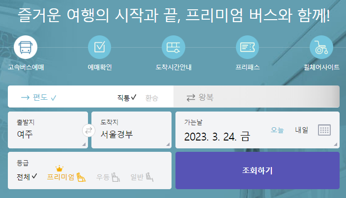 여주 고속버스터미널 시간표를 확인하기 위해서 고속버스 통합예매 홈페이지을 접속하시면 가운데에 예매하는 메뉴가 있습니다. 편도인지 왕복인지를 체크를 합니다. 출발지를 여주으로 선택하고 도착지를 서울경부로 선택하였습니다. 가는날짜를 (2023.03.24) 선택하고 조회를 클릭합니다.
